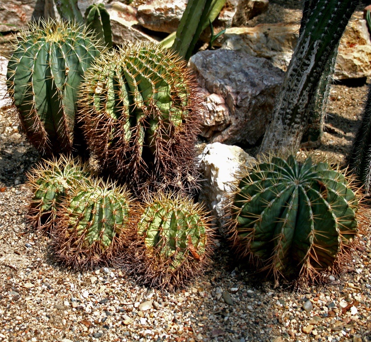 Barrel cacti (Ferocactus and Echinocactus genera) are large, cylindrical cacti native to the deserts of North America. Their accordion-like ribs allow them to expand and contract as they absorb and use water, functioning like a living water tank. A large barrel cactus can store several hundred liters of moisture in its spongy tissue. The fishhook barrel cactus (Ferocactus wislizeni) develops a pronounced lean toward the south or southwest, earning it the nickname 'compass cactus.' Their thick, hooked spines provide shade, reduce air flow near the skin to minimize water loss, and channel rain toward the roots. Some species can live for over 100 years.