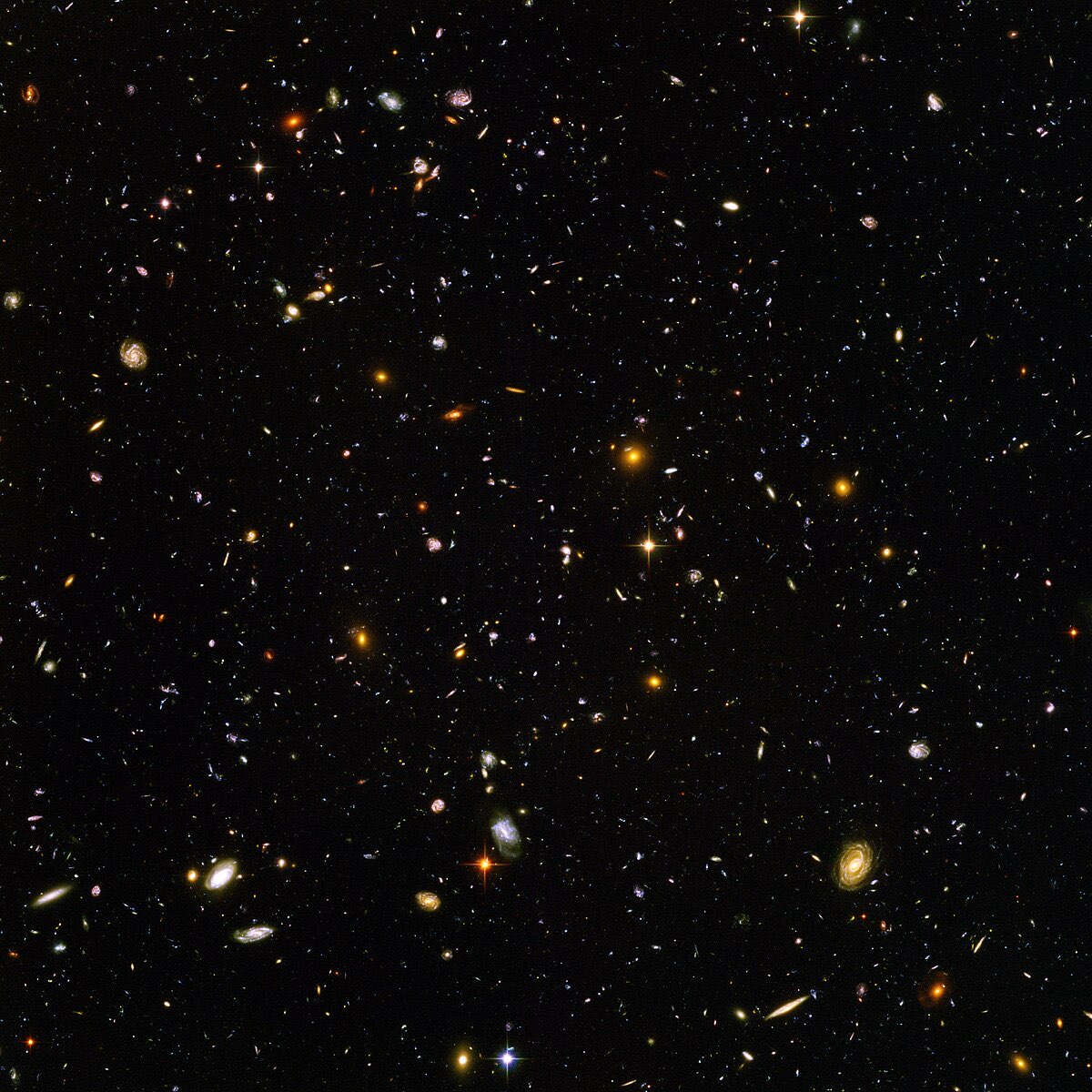 The Hubble Ultra Deep Field, captured in 2004, is the deepest visible-light image of the universe ever taken. It shows approximately 10,000 galaxies in a patch of sky just 3.4 arcminutes across (about 1/13th the diameter of the full Moon). The most distant objects in the image are seen as they were just 800 million years after the Big Bang. The total exposure time was over 11 days.