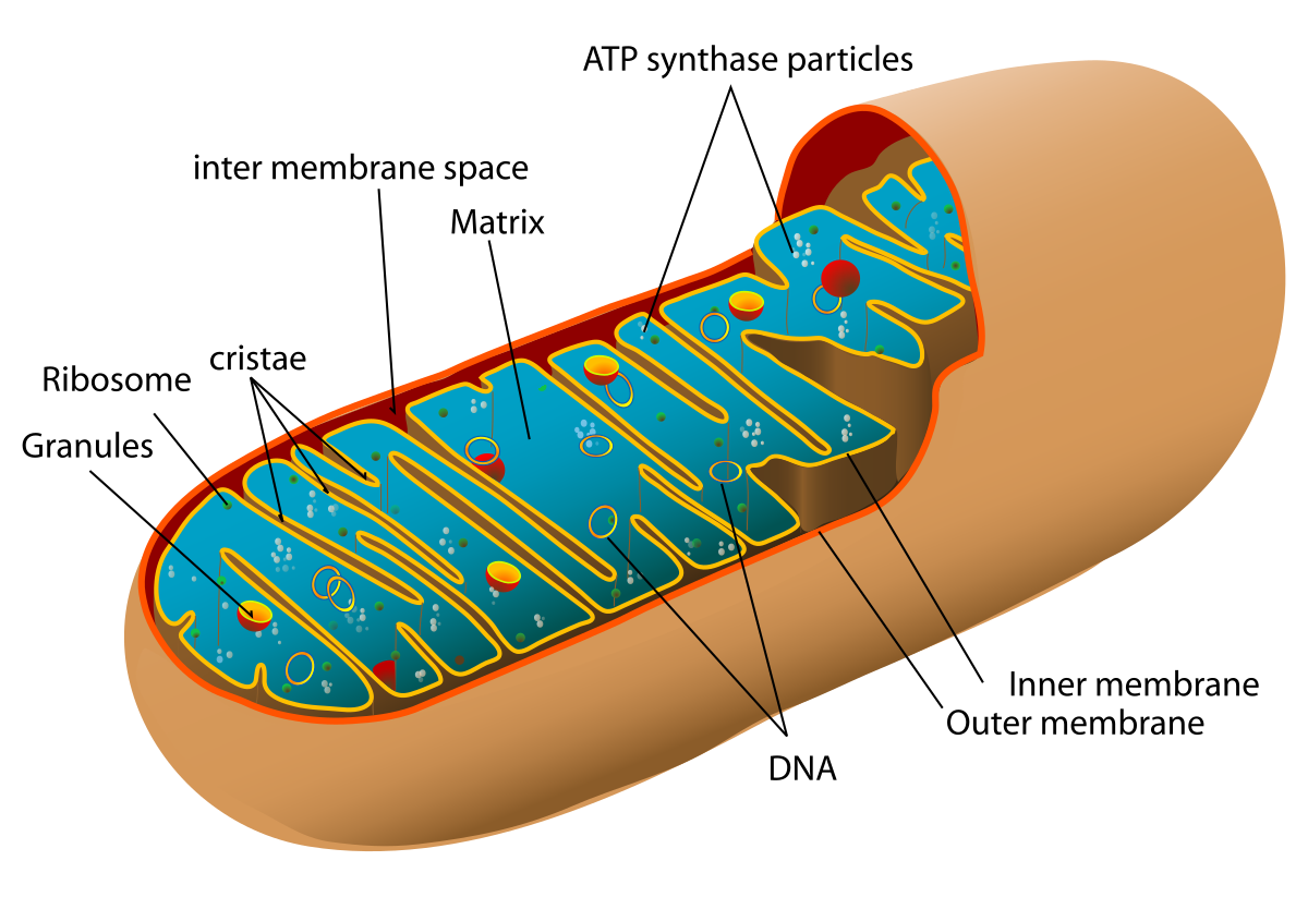 A mitochondrion is a tiny organelle about 1-10 micrometers long that generates most of the cell's ATP, the molecular fuel of life. Each human cell contains hundreds to thousands of mitochondria, and they have their own DNA, which is inherited exclusively from your mother. They are thought to have once been free-living bacteria that were engulfed by an ancestor of modern cells about 2 billion years ago.