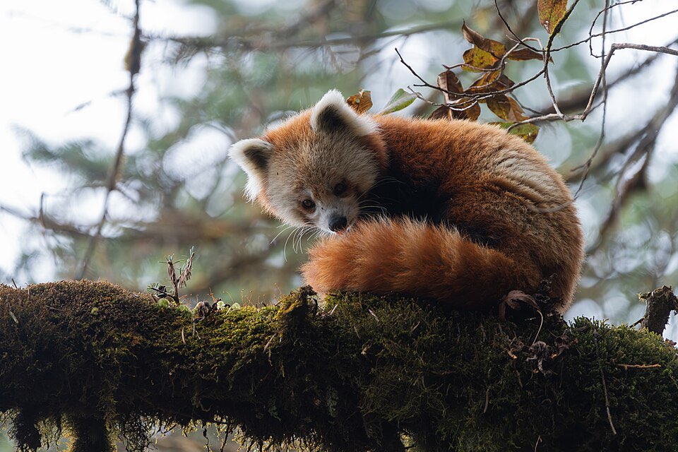 The red panda (Ailurus fulgens) was described in Western science in 1825, nearly half a century before the giant panda. Despite the name, they are not closely related to giant pandas and are the sole living member of their family, Ailuridae. Their bushy, ringed tail serves as a blanket in cold weather and a balance aid when climbing. They spend most of their lives in trees and are crepuscular, most active at dawn and dusk.