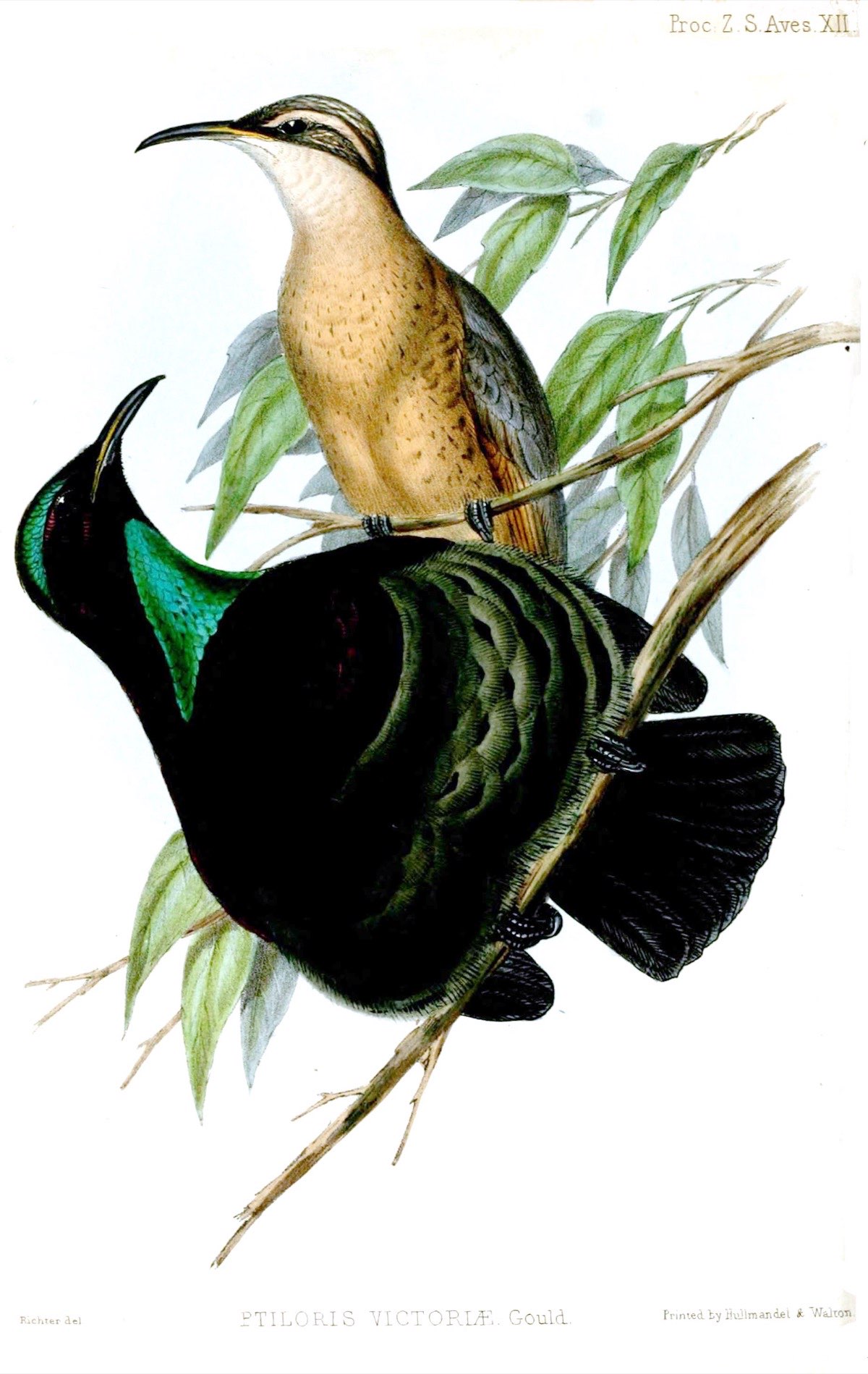 The magnificent riflebird (Ptiloris magnificus) is a species of bird of paradise found in the tropical rainforests of New Guinea and far northeastern Australia. Males are about 34 cm long with glossy black plumage and an iridescent blue-green breast shield. During courtship, the male perches on an exposed branch, spreads his wings into a broad cape, and sways rhythmically while repeatedly opening his beak to flash the bright yellow interior. The display is so precise and mechanical that it looks almost robotic.