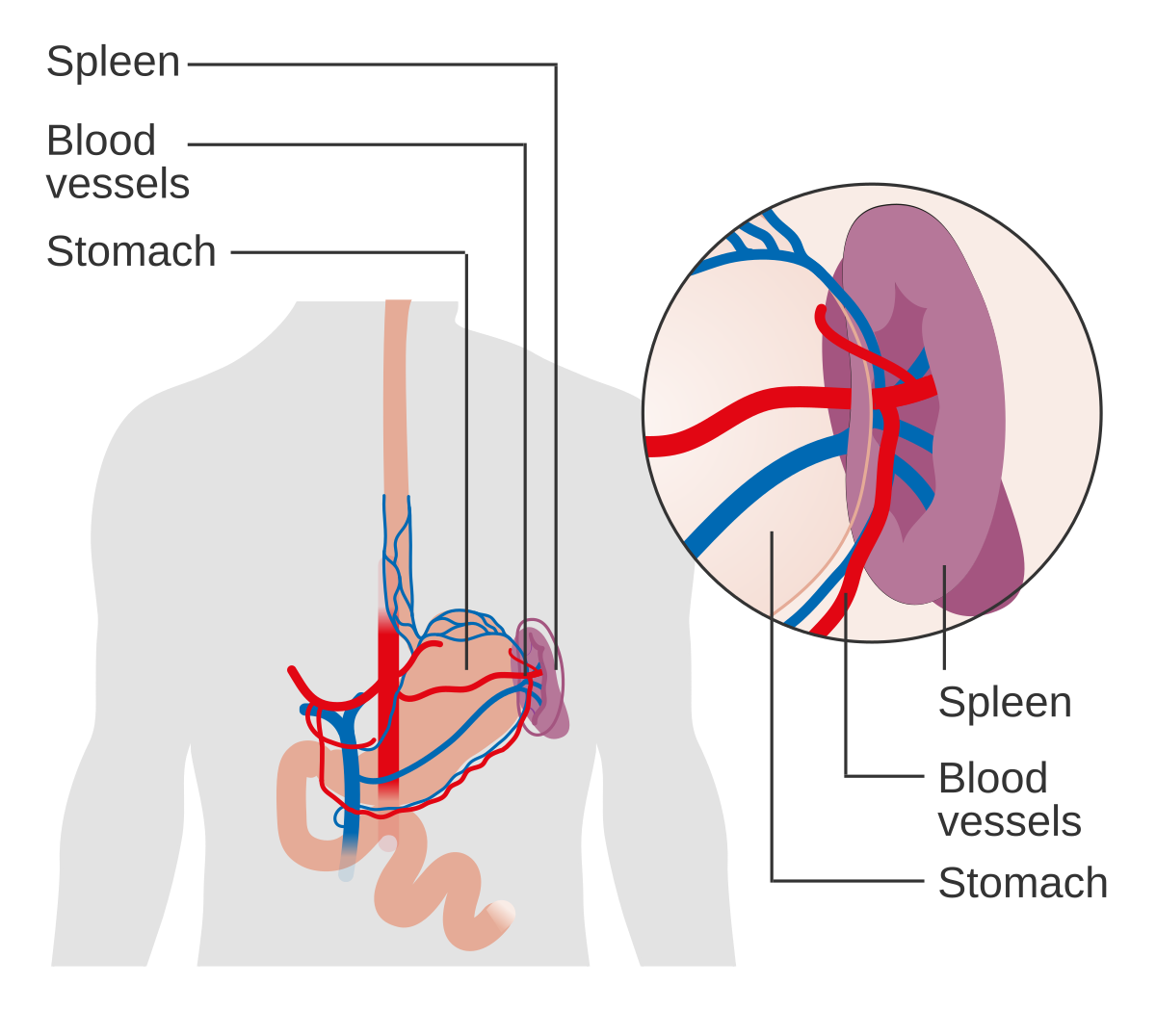 The spleen sits in the upper left abdomen and filters blood, removing old or damaged red blood cells. It also stores a reserve of blood and produces white blood cells as part of the immune system. Despite its functions, humans can survive without a spleen.