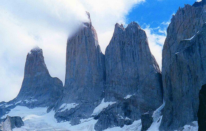 The Torres del Paine are a cluster of three distinctive granite peaks in the Torres del Paine National Park in Chilean Patagonia. The three towers, from south to north, are Torre Sur (2,850 m), Torre Central (2,800 m), and Torre Norte (2,600 m). They are the eroded remnants of a laccolith, a mass of igneous rock that intruded into older sedimentary layers roughly 12 million years ago. Glacial erosion during the ice ages carved the towers into their current dramatic form, with sheer faces rising over 1,000 meters above the surrounding terrain. The national park surrounding them covers about 2,420 square kilometers and is home to guanacos, pumas, and Andean condors. The W Trek, one of the most famous hiking routes in South America, passes directly beneath the towers.