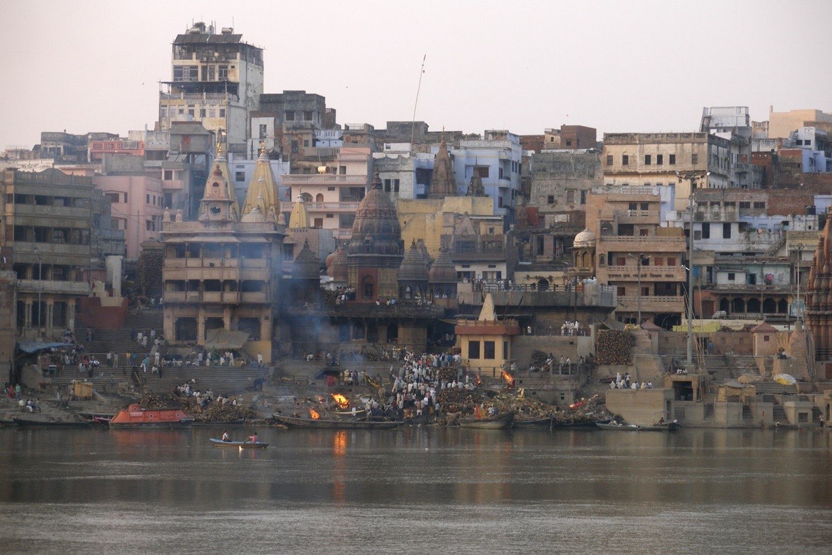 Varanasi (also known as Benares or Kashi) is a city on the banks of the Ganges River in Uttar Pradesh, India, and is widely regarded as one of the world's oldest continuously inhabited cities, with evidence of habitation stretching back roughly 5,000 years. It is the holiest city in Hinduism: Hindus believe that dying in Varanasi and being cremated on the banks of the Ganges breaks the cycle of rebirth and grants moksha (liberation). The city's ghats, a series of 88 stone steps leading down to the river along a 6.8-kilometer stretch, are the scene of daily rituals, cremations, and the famous Ganga Aarti ceremony each evening.